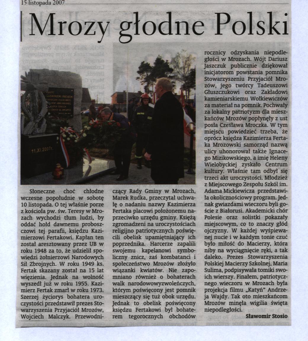 Odsłonięcie pomnika ku czci ks. Kazimierza Fertaka w Mrozach